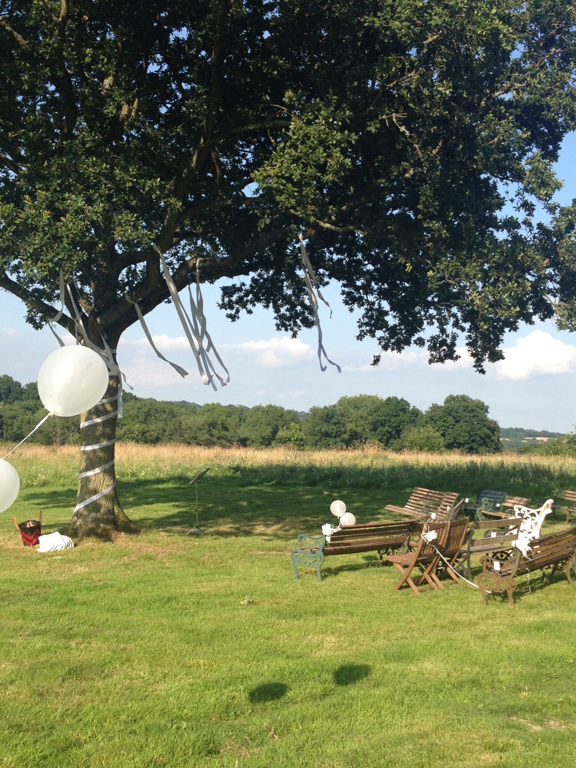 Helen and Dave run a reclamation yard, and married under the oak tree in the field behind their business. The guests sat on a wonderful array of chairs, taken from the yard for the day. They included garden chairs, park benches, barrels, and all sorts. The groom and best man were detectorists. They wanted to bury the ring and find it with a metal detector. Rather to my relief, they gave up on that idea. It would have been fun, but as the celebrant you’re responsible for making things go smoothly, and there could have been problems!